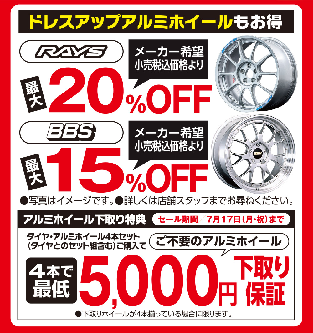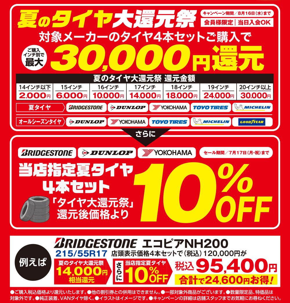 十日市場夏祭り「タイヤ・アルミ」 1年で最もタイヤをお得に購入出来る「夏祭りセール」の特典をご紹介致します。【対象のタイヤ4本セットがお得】ブリヂストン・ヨコハマタイヤ・ダンロップの対象のタイヤが4本セットで最大3万円の還元割引と更に10%OFFにてご提供致します。【ドレスアップホイールがお買得】愛車のドレスアップは足元から!クールなアルミホイールを装着して、愛車をドレスアップしては如何ですか?