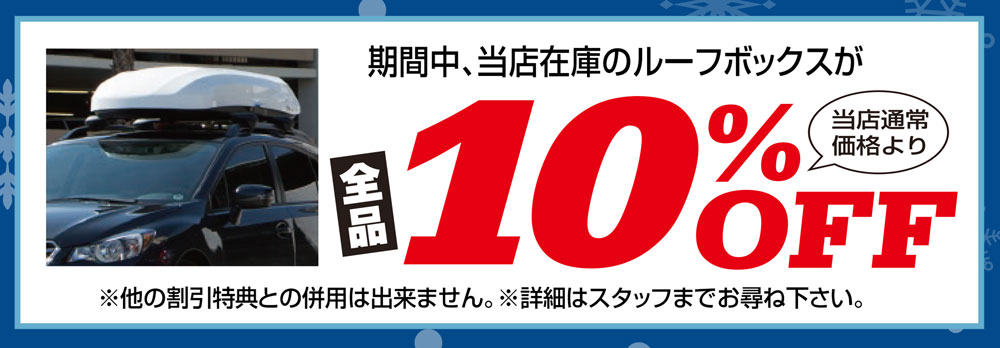期間中、当店在庫品に限りルーフボックスを全品10%OFFにてご提供致します。