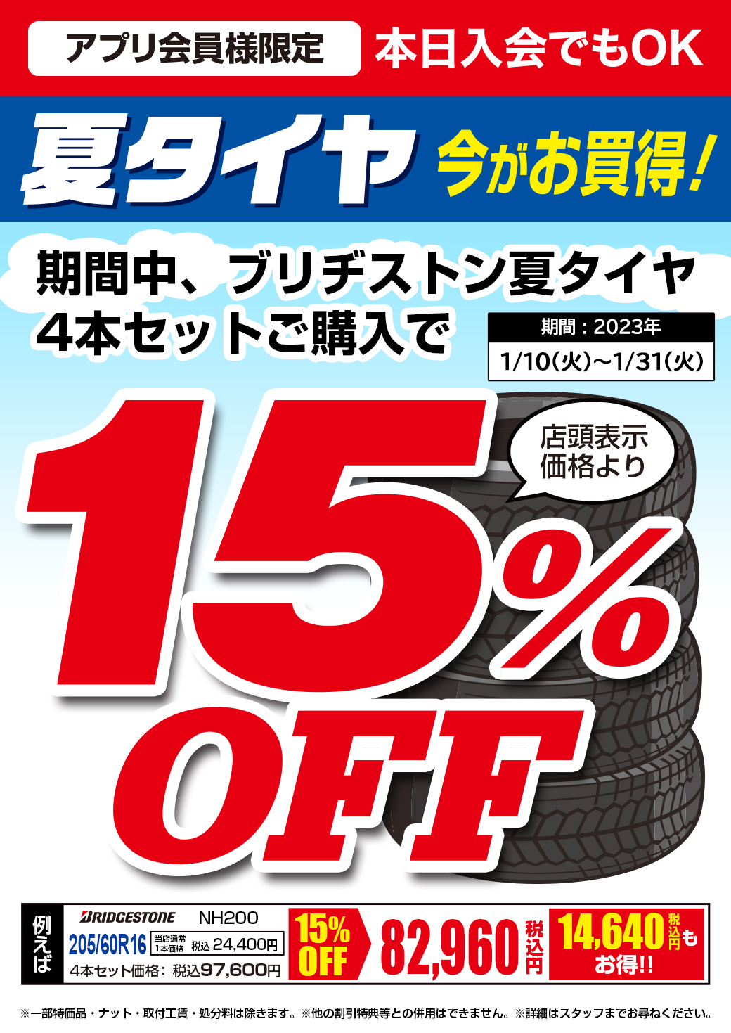 対象の夏タイヤ4本セットが15%OFF!